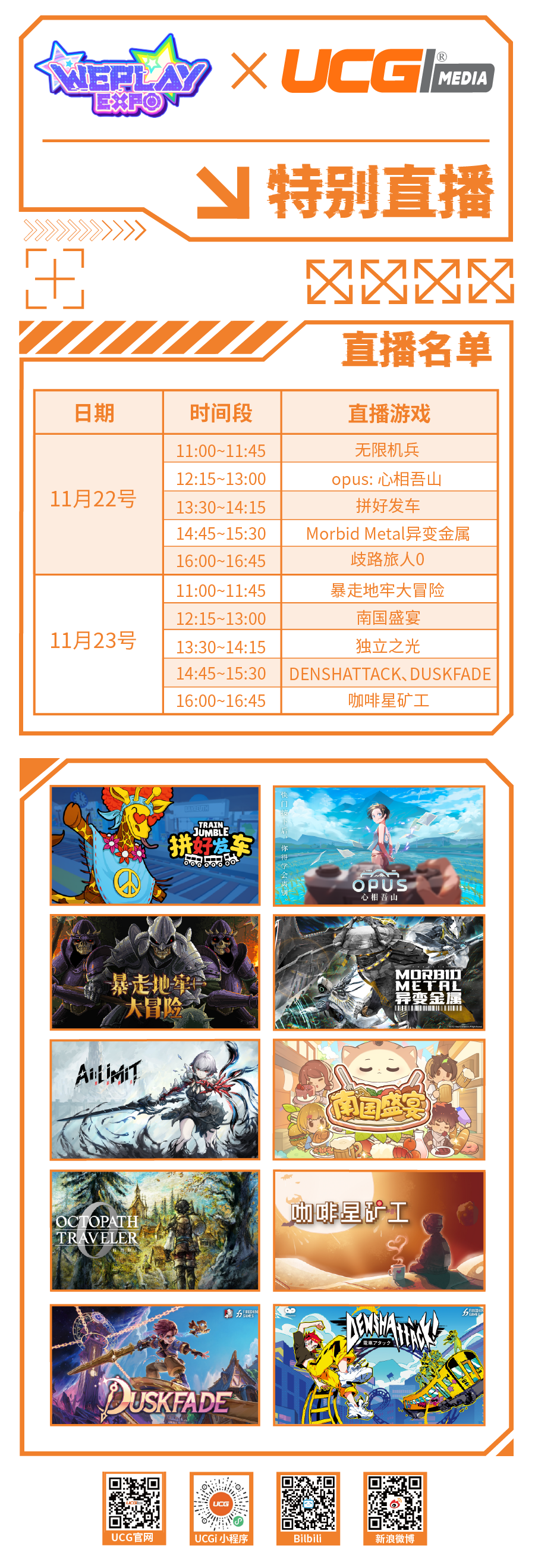 UCG直播间将带来《OPUS:心相吾山》《异变金属 Morbid Metal》《拼好发车》《暴走地牢大冒险》《咖啡星矿工》《南国盛宴》《DENSHATTACK》《DUSKFADE》《歧路旅人0》等多款游戏的现场试玩,带你领略它们的独特魅力。具体节目单及直播时间可见下图。