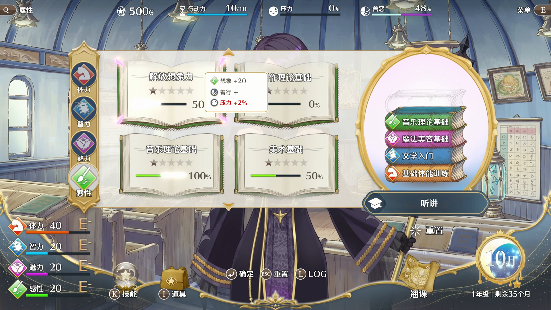 在女儿就读的王立魔术学级中,玩家可以通过“剑术”“魔法”“社交”“艺术”等不同类别的课程,自由提升她的智力、魅力等各项属性。