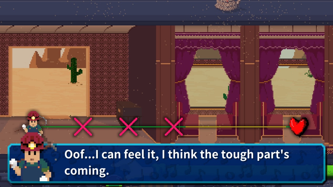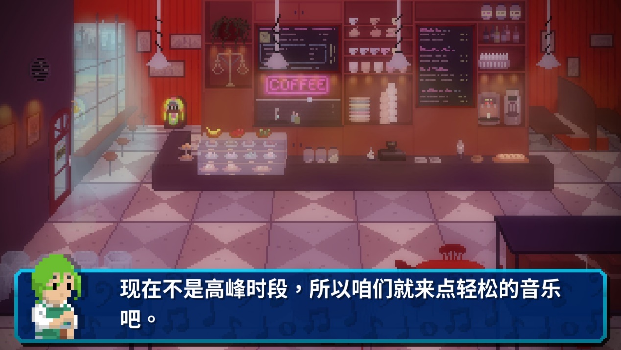 此外精致的像素美术同样添色不少。在2-3中为咖啡店员工提供治疗时,玩家的每次成功输入都会帮助服务员向店门外徒手抛投咖啡,光就这段动画的确有点《节奏天国》的味道。