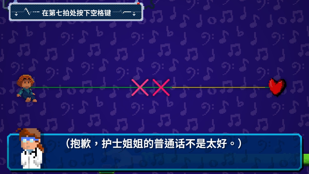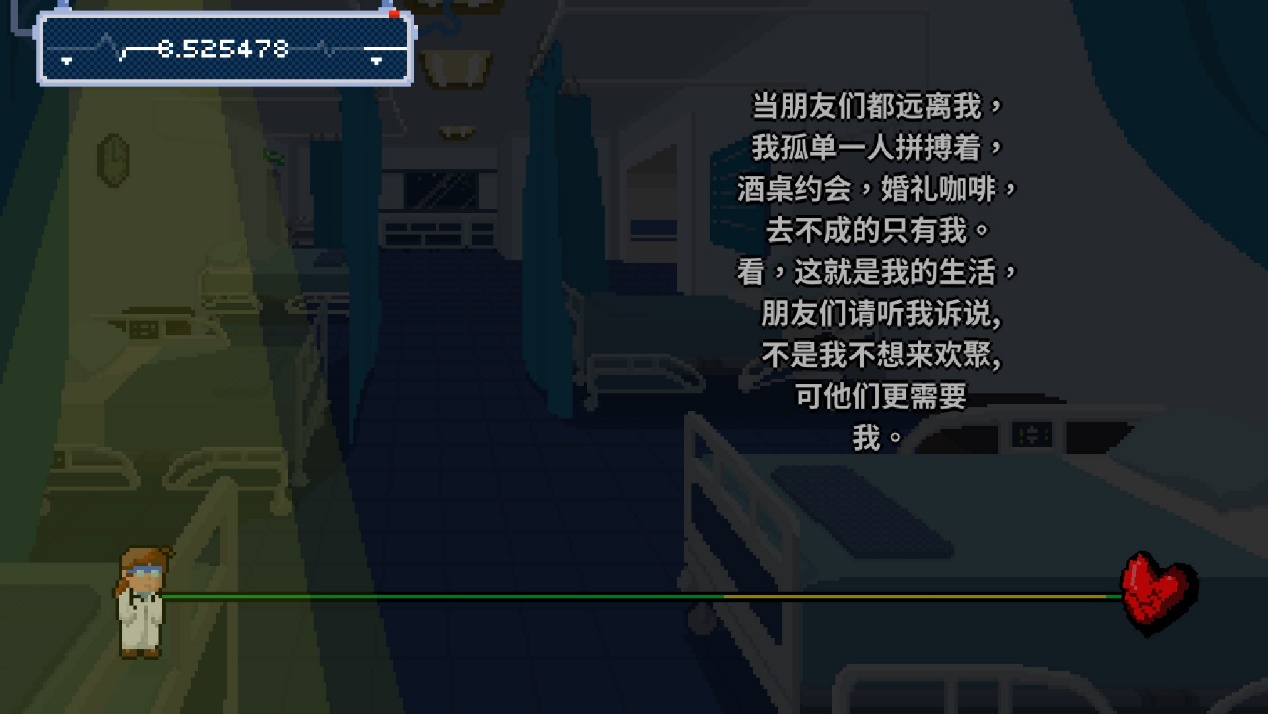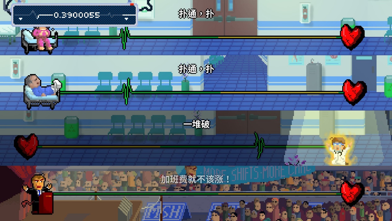 玩家将扮演一位来医院实习的员工,利用最新的节奏疗法,通过一个简单的按钮,将患者们躁动的心脏重新安定下来。