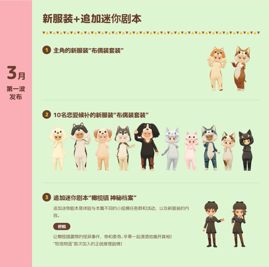 如今DLC早已成为了为游戏添枝加叶的一大重要因素,本作也是系列首次引入了DLC,内容包含主角与恋爱候补的“新服装”,体验与游戏本篇不同剧情的“迷你剧本”,以及为纪念《牧场物语》系列25周年,以过去的3部作品为题材,追加恋爱候补和居民的“恋爱候补包”。追加恋爱候补的时间以及出处分别为:4月追加《牧场物语 起源的大地》中4名角色;6月追加《牧场物语 连接新天地》中4名角色;8月追加《牧场物语 三个村庄的珍贵朋友》中的4名角色。