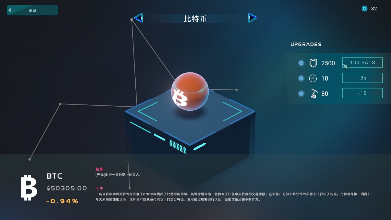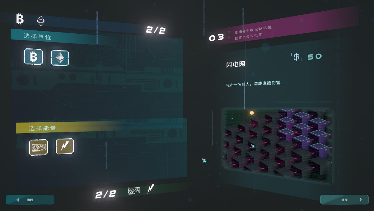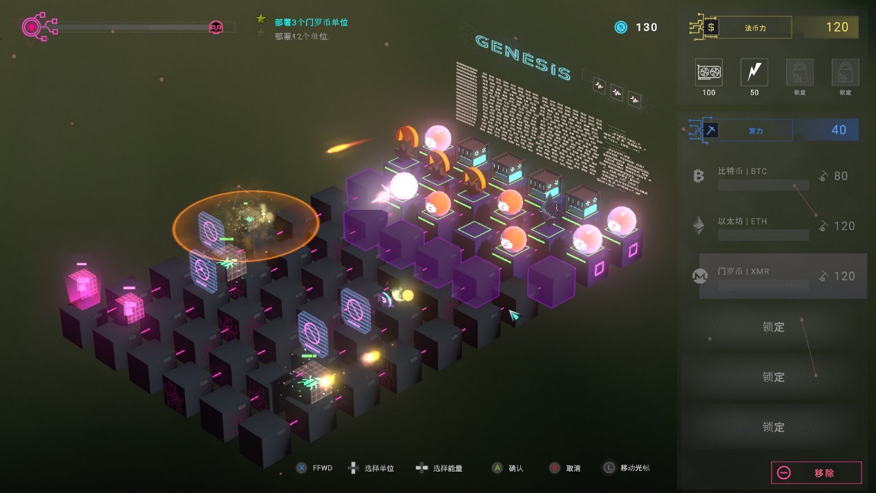 至于战斗与生产单位的选择,生产单位能够产出相当于金钱的“算力”,战斗单位则需要消耗算力才能放置。这些战斗单位其实就是各种加密货币,比如大家听得最多的比特币,以及各种许多人可能闻所未闻的瑞波币、以太坊币等等。这些币在游戏中各具作用,有些能够发射等离子光束消灭敌人(即对方黑客“派出”的攻击单位),有些可以囚禁敌人让其无法行动,而有些则可以变成耐力值极高的龟壳盾牌,极大地阻碍敌人的推进,这些多变的货币特性构成了本作的塔防基本策略元素。