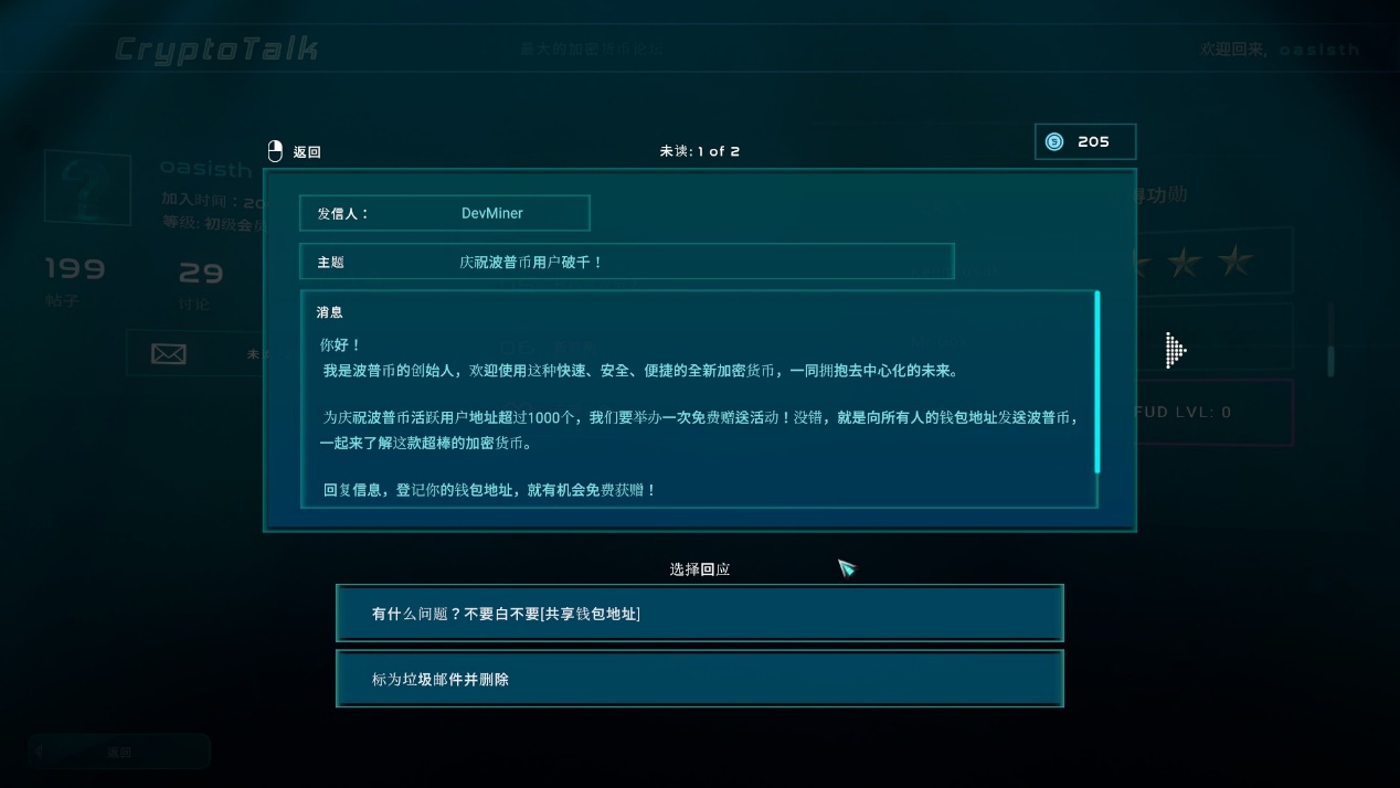 而另一项可能出现的“麻烦”则是收到各种各样的邮件,玩家可作出两种抉择,一个是花费蓝币进行回应邮件的内容,结果有好有坏,好的情况能够获得蓝币,坏的情况则损失蓝币,内容的文字就如同现实生活中可能遇到的“电信诈骗”,如果上面出现要求你提供地址这样的可疑信息,就要思考一下是否回应了;另一个选择则是将邮件标为垃圾并删除,不会有任何获得但也不会损失。这两种邮件选项都会影响到后续剧情的发展,最终你是被对手发现真身,还是先找到幕后黑手,全看操作,也算为游戏提供了一种另类的自由度。