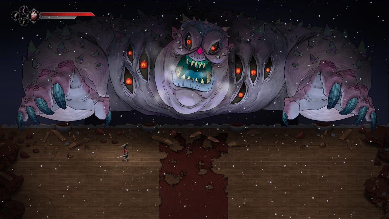 第一个是大赛版的《暖雪》或许是为了给评委们足够的开场震撼,有一个比较固定的起始关卡,里面固定会让主角路经一处悬崖,并看到远处皇城上盛开的巨大莲花喷吐暖雪的全过程,这是一个很有冲击力的视觉剧情叙述,也为之后主角一路杀入城中时碰到的各种化为怪物的市民和动物作出了一个很好的铺垫。