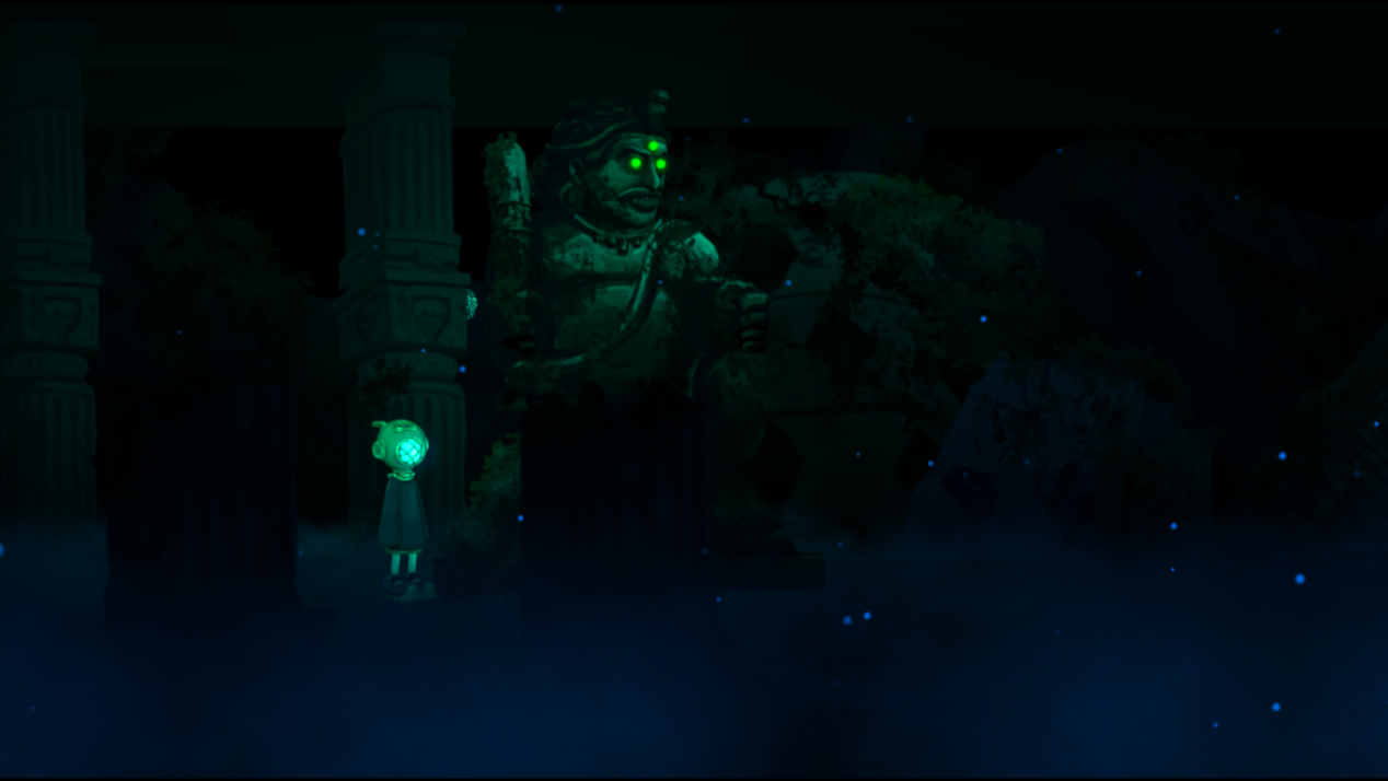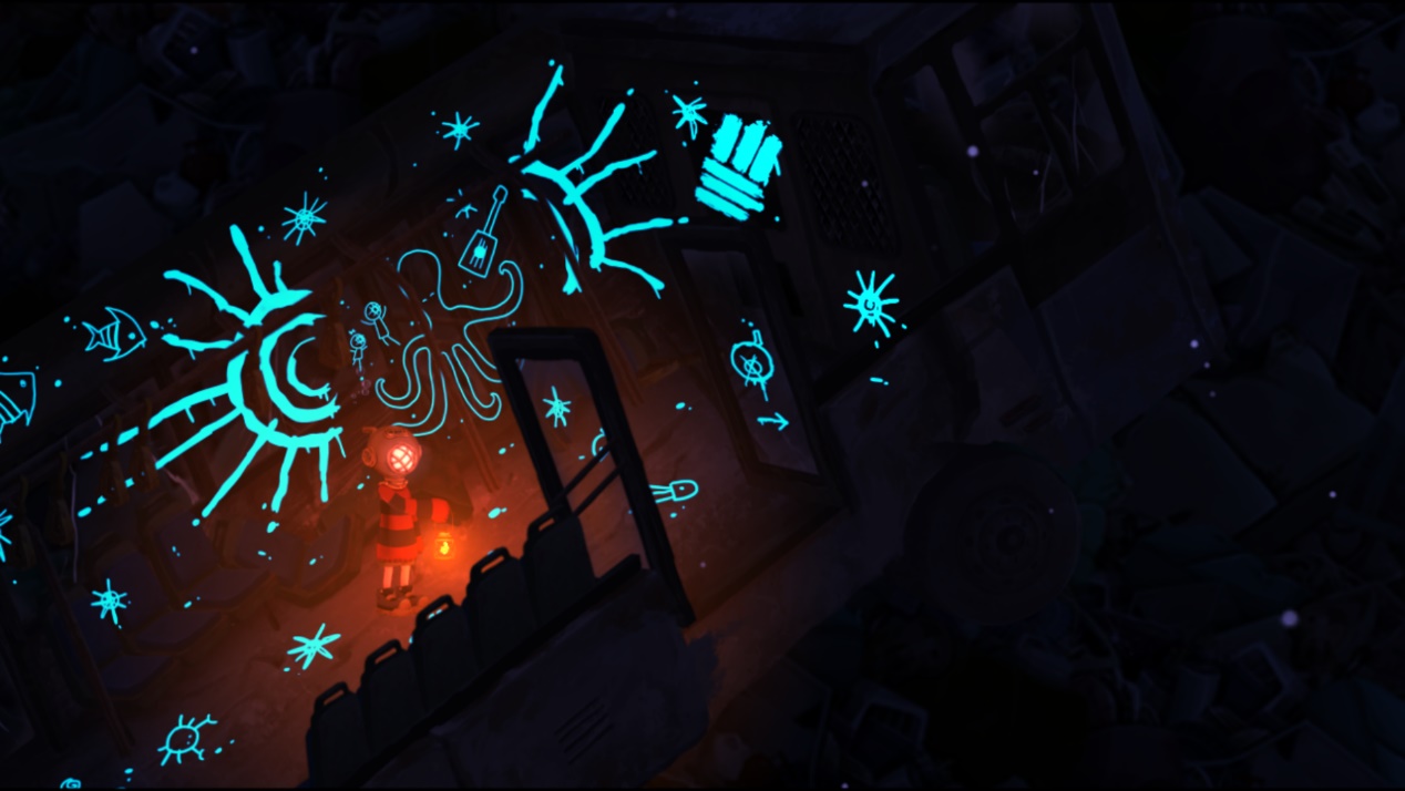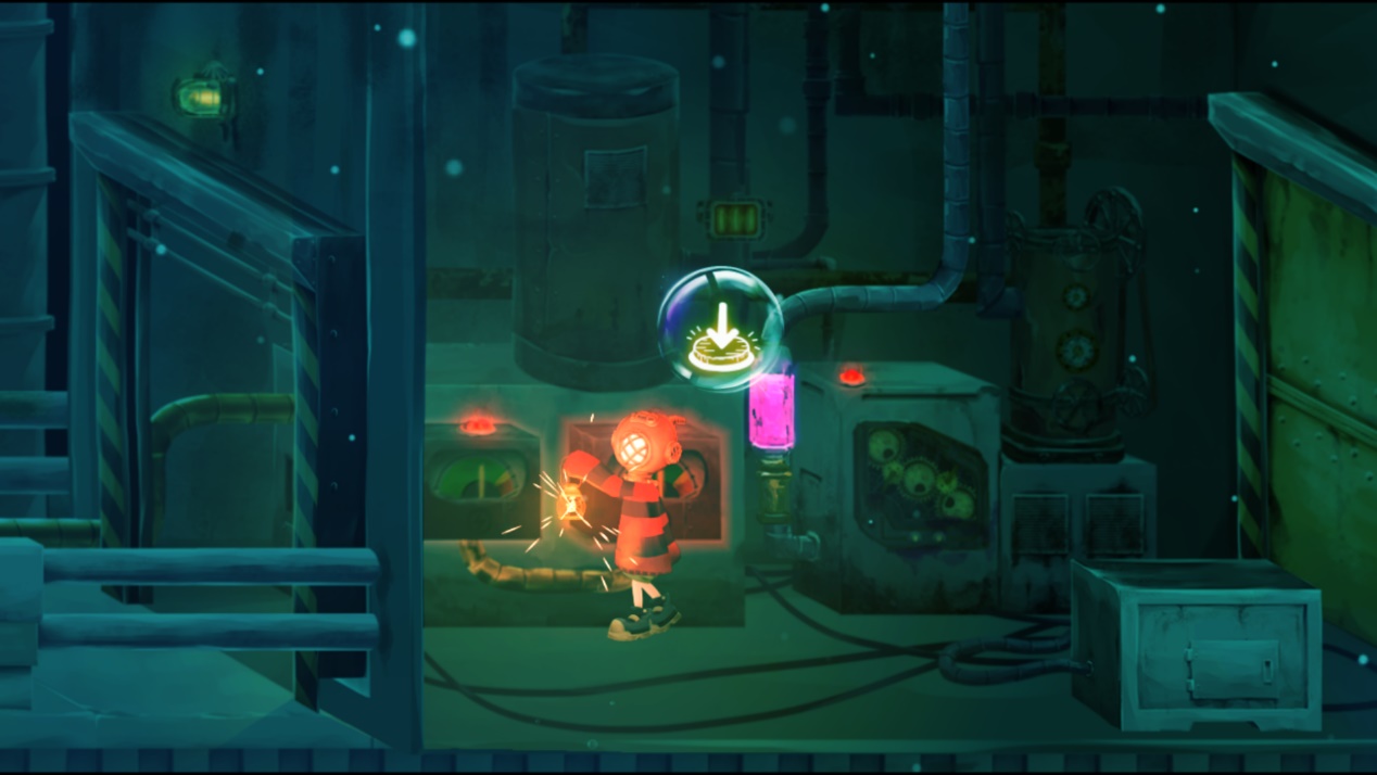 游戏开场,一个戴着复古潜水头盔的小男孩慢慢坠落海底,在一条大鱼面前拿到一盏提灯后,开启了一段探索海底,寻找返回陆地道路的旅行。