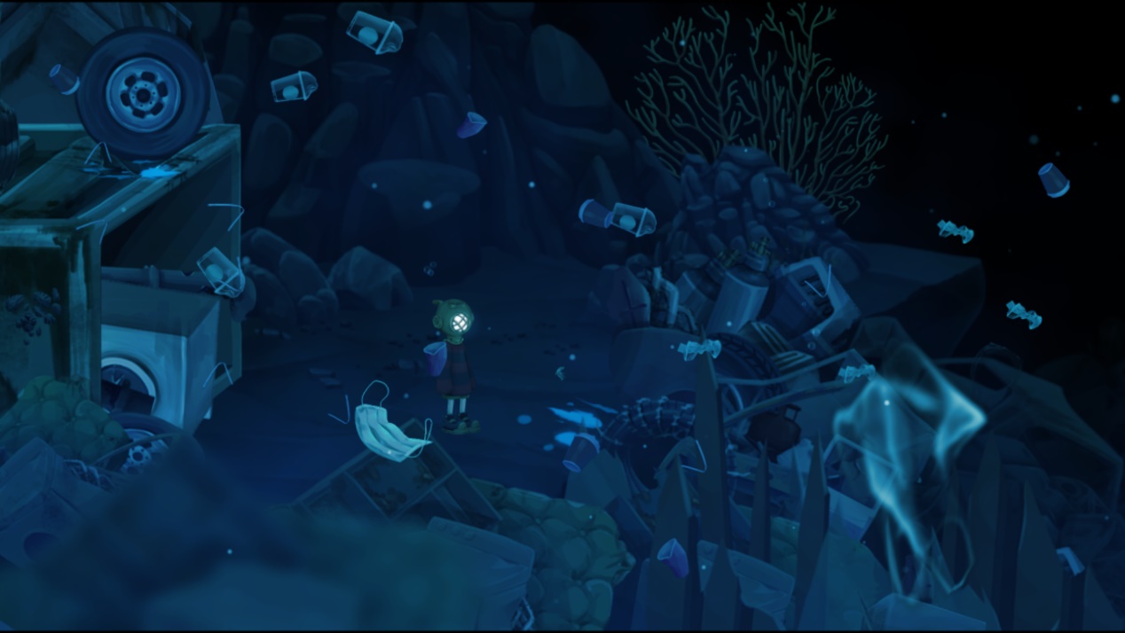 本作以手绘风格描绘了奇幻又真实海底世界,包括稀少且独特海洋生物、冰冷的机械工厂、阴森而神秘的神殿、末日降临般的海底城市废墟、堆积如山又随处可见的垃圾等。而一些常见垃圾,像形如水母的塑料袋、口罩、塑料汽水罐和吸管,这些不少出自Khayalan Arts为举办各项环保活动而创作的宣传手绘画里。