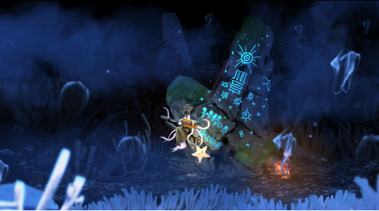从平静的海底表层,到神秘组织的基地、奇怪的神殿、鲸鱼腹,最后到达海底废墟再返回地面,在游玩途中常常能看到一些散发着明亮蓝光的壁画,拿着提灯靠近就能看到壁画的全貌,这里面包含着大量的剧情和背景故事相关的信息,在通关后的选章里还能看到代表各章剧情的多张壁画。