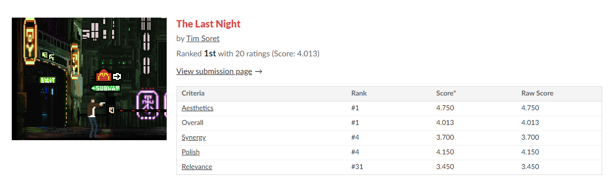 2014年3月1日,刚成立一年的itch.io开始了他们的第三次Game Jam,而这次的主题是当时还不具备今天这般影响力的赛博朋克(Cyberpunk)。活动一共有246个参赛者,265个参赛作品,虽然比起现在的Ludum Dare和Global Game Jam规模略显袖珍,但产出的作品质量毫不逊色。其中就有现在在Steam上好评如潮的视觉小说《VA-11 Hall-A 赛博朋克酒保行动》(VA-11 Hall-A: Cyberpunk Bartender Action)游戏原型,不过它并不是本文的主角,今天我们要聊的是这届Cyberpunk Jam的冠军作品——《最后的夜晚》。