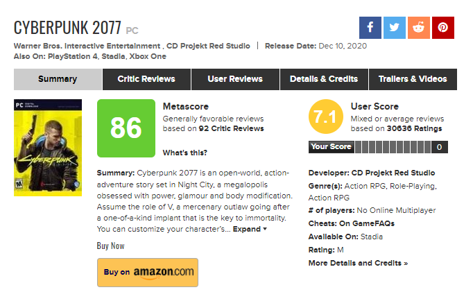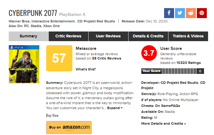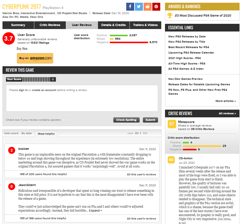 ▲Metacritic上《赛博朋克2077》的PC版和PS4版评分差异还是挺大的。