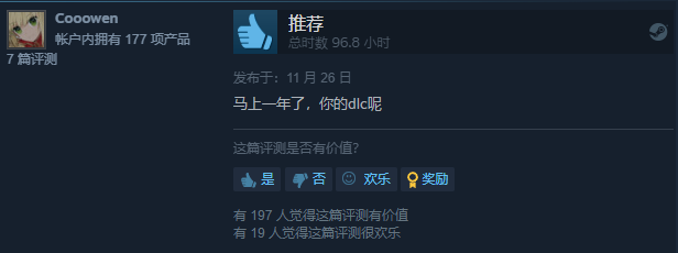 例如多半好评里的“好评”不乏有一些批评声音,像是吐槽DLC到一年后的今天也没有个影。