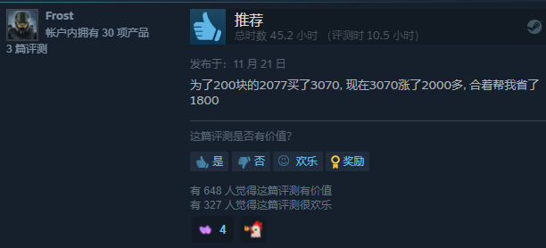 更别提有一些完全是歪楼,就是感谢这游戏让大家提前买到了原价的30系显卡,不用被奸商宰一刀。(笑)