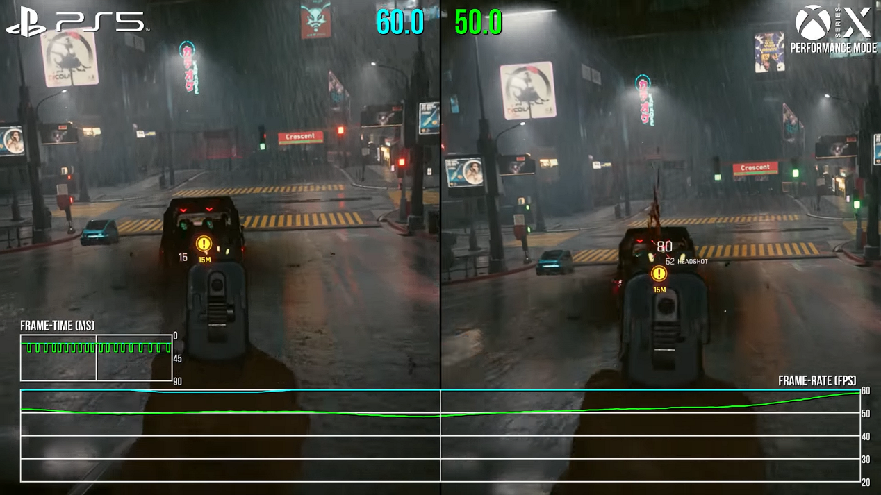如上图,Digital Foundry在1.23版补丁上线后测试了一下PS5和XSX上用向下兼容模式运行《赛博朋克2077》的表现,前者已经可以较为稳定地在60帧下运行,但代价是NPC数量大幅度减少。