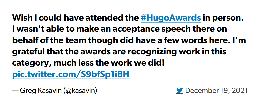 直到15年后,评委会才找到合适的时机弥补当初的遗憾,本届雨果奖评选委员会联合主席科莱特·福扎德表示: