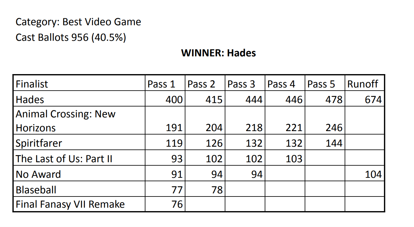 《黑帝斯》获得了183张提名票,是第二名《集合啦!动物森友会》的3.5倍。这个情况也在最终投票中延续,在首轮投票中就以超出第二名1倍的优势已经奠定了胜局。