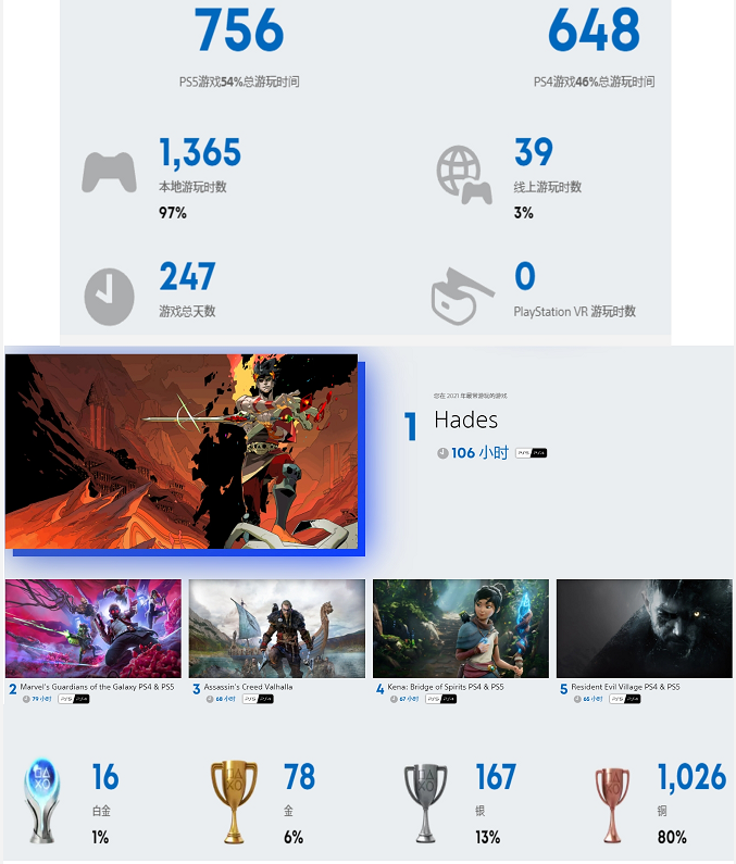 虽然我已经忘记了2020年的游戏总时长,但2021年在PS上的总时长能达到925小时还是有点惊讶的,特别是考虑到去年我已经不怎么摸PS4(那时的我还没有PS5)。