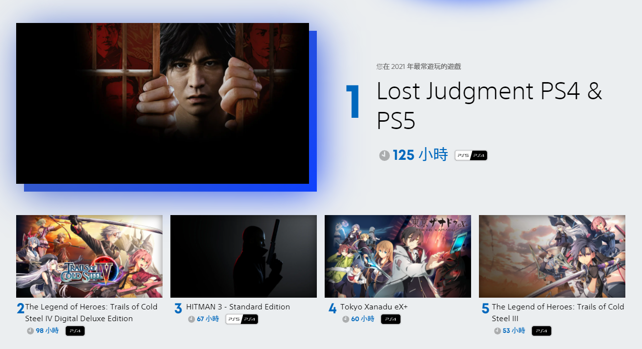 不过看了一下个别游戏的游戏时间还是能得出答案,因为大部分时候我都在挂机打字——前五里的《审判之逝》和《杀手3》攻略都是我负责的。其余三个其实是我在补游戏而已,如果对我杂志里小编寄语的内容有印象的读者应该会依稀记得,我一直在补《闪轨》四部曲,花了两年时间打完最后两部,2021年底才算是完成。
