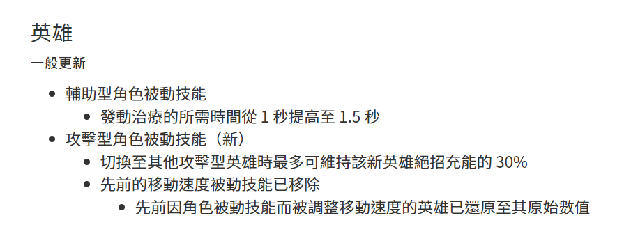 2.输出英雄在上个BETA获得的职能通用被动增益被完全修改,原本的提升移速效果被移除,改为更换英雄后可以保留最多30%的终极技能充能。