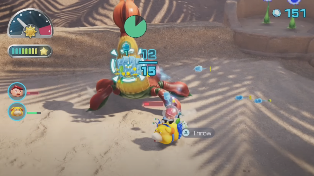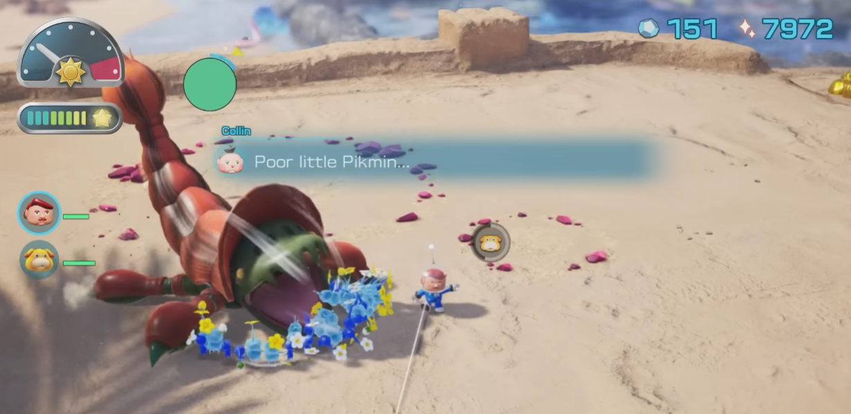 在战斗部分,本作拥有极强的动作性。比如打这个“蝎子怪”,像传统即时战略,直接全军框住A过去就可以了。但是在本作中,这种操作并不适用,很可能对面一招就能让我方皮克敏全军覆没。