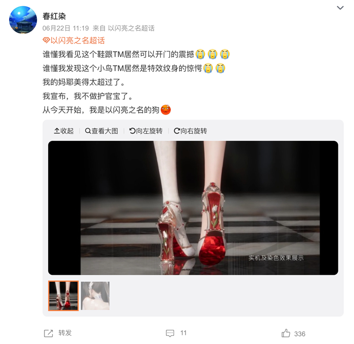 第二点喊话行业的底气就是从原画设计到3D模型的360度无死角建模,称之为“无损”建模都不为过了。在游戏行业中不乏原画好看的各种设计,不论是角色本身的设定,还是更偏时装设计的概念稿,从惊为天人到一文不值往往只需要一个3D的距离。即使是在强如《王者荣耀》的MOBA游戏中,也经常有原画设定非常带感的角色,上线后由于3D模型效果被喷到回炉重造的情况。但显然《以闪亮之名》并不存在类似的问题,甚至在模型的细节上还在持续内卷,做出了在模型中连鞋跟都不放过设计的“变态”之举。鞋子上增加的水晶和宝石等等这些装饰品虽然算不上复杂,但出彩的是在瓷心傀儡六星套装的鞋跟上,居然增加了一个双开门的小设计,打开之后就会出现一朵娇贵的花朵。不得不说,本身这个鞋跟的设计已经很出彩了,如果类比的话很像是大牌口红的外包装,在增加了可开关的门和花朵这亿点点的设计细节之后,更凸显出了《以闪亮之名》在模型和3D设计层面上的突出能力了。