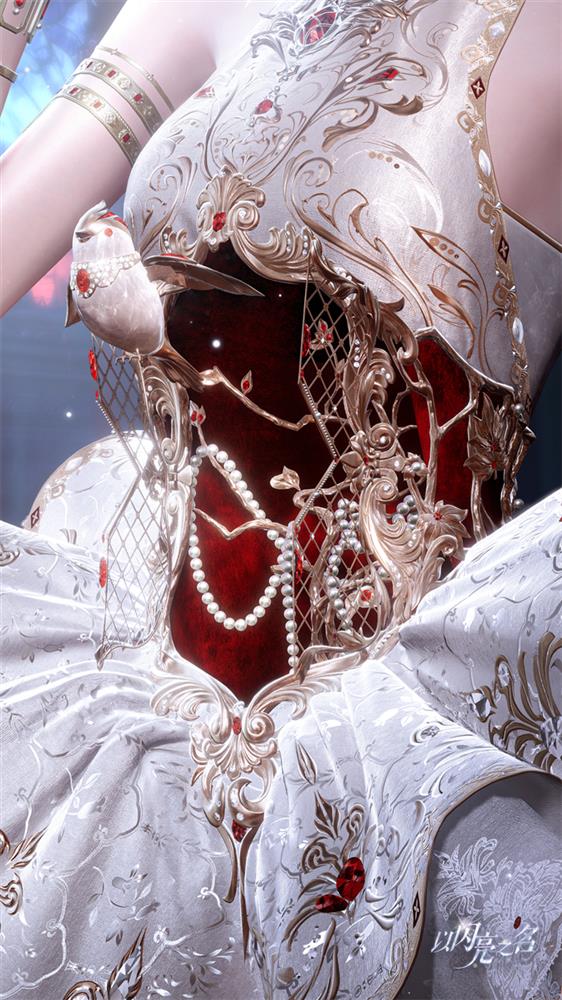 说完了模型和设计,再看回这套3.0技术力代表的瓷心傀儡六星套装整体,全身以白色为主,红色和金色作为点缀组成了这套最独特的限定时装。看过一眼就不能忘记的设计元素一定是腹部镂空的鸟笼设计,不仅凸显了角色的腰身纤细柔美,在鸟笼的双开门打开的时候,鸟儿重获自由,与角色亲密互动,这种略带诡异的美也让这套时装以“傀儡”为主题的设计理念展露无遗。当然为了让这套时装显现更好的质感,在采用了半透材质的裙身上,还加入了大量的金属花纹作为装饰。