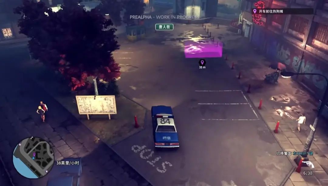 场景与光影偏向写实,脏兮兮的破败街道、湿漉漉灰蒙蒙的天气,瞬间让我联想到《疤面煞星》之类的犯罪片,想起那个混乱、暴力的上世纪80年代。玩法上采用了俯视角的开放世界,UI和操作方式也很GTA。
