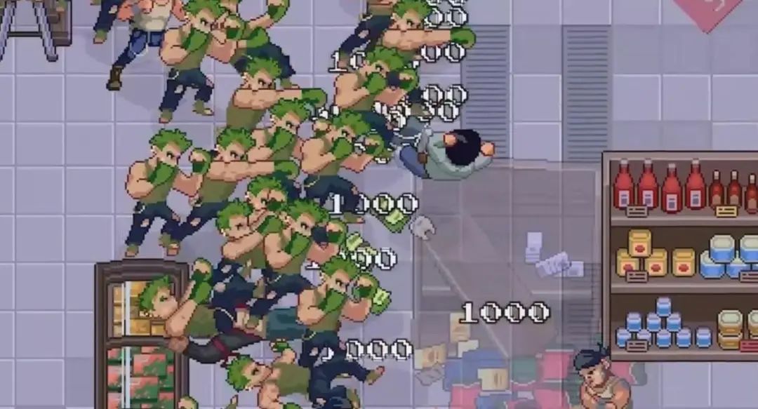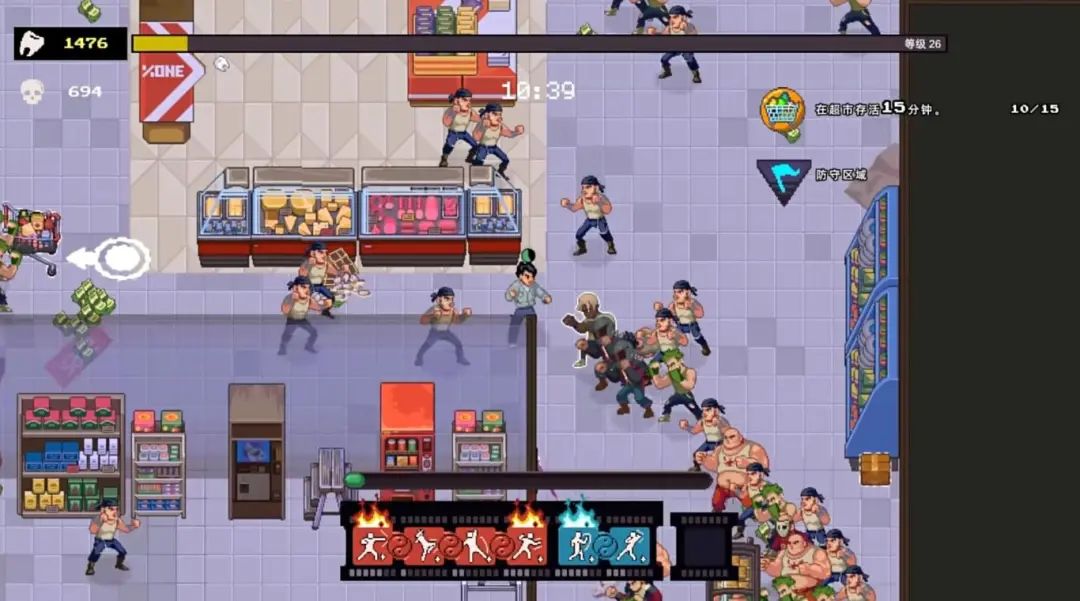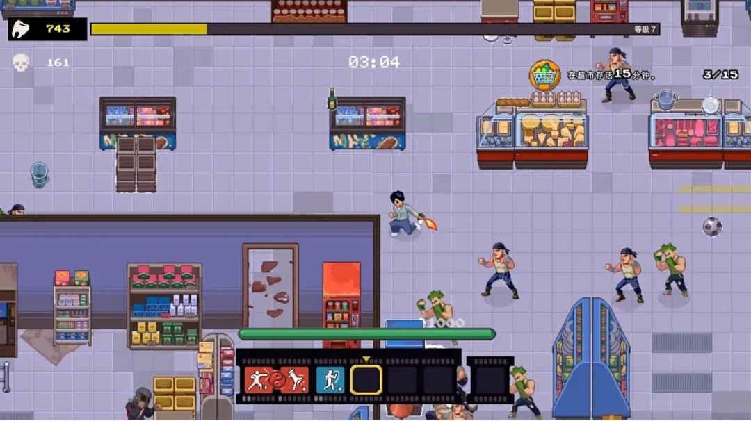战斗花样很多,反而在基础设计上有点小翻车。敌人的伤害判定非常粗暴,碰到就有伤害,但是主角只有近战,清怪效率属实不高,加上中期开始的大量堆怪,一个走位不甚就需要直挺挺穿过人群,刷的一下掉不少血,这帮人是阳了吧我碰一下就掉血。这时候我想用家具,但互动都是自动触发,经常误触,尤其是这购物车,一脚连车带生存希望一脚干废。