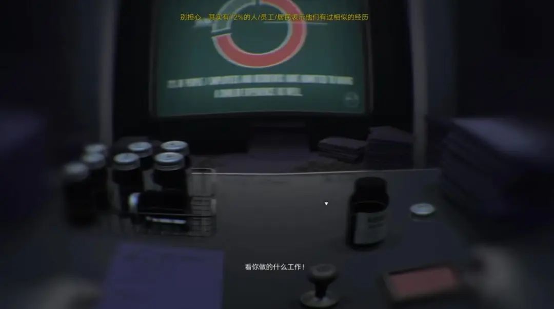 最吸引我的,就是故事和题材。光关键词就有1984、东德、老大哥、画饼、反乌托邦,制作组还融合了灵异、脑内潜入等元素,试图在本作中讨论相当多的主题,往大了讲,涉及监控与自由、高压重复的工作对人的异化、自我认知,往小了讲,有具体的人的家庭、爱情、失去等。