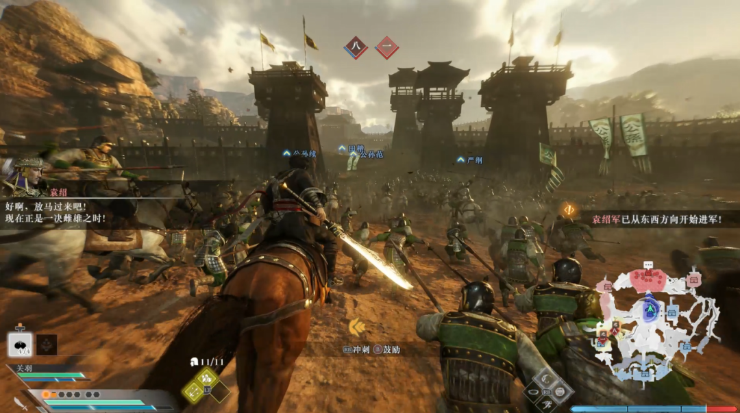 这次战场对我的震撼,堪比童年第一次上手体验无双割草,就怎么可以这么劲、这么爽?全员集结冲锋的突击,敌我都有、但我方一旦发动就堪比奥特兄弟大集结的大战法,温酒斩敌将时的队友夸夸,再加上依然劲爆的金曲,团团包围下的单挑死决,信我,只要上手一次就胜过我在这吹半天。随着流程推进,战场越来越大,参战方、同屏人数越来越多,多到甚至让我觉得没有那个必要吧,更像是纯纯炫技。但这些华丽演出,我认为都是为集中体现在士气系统的策略玩法服务。
