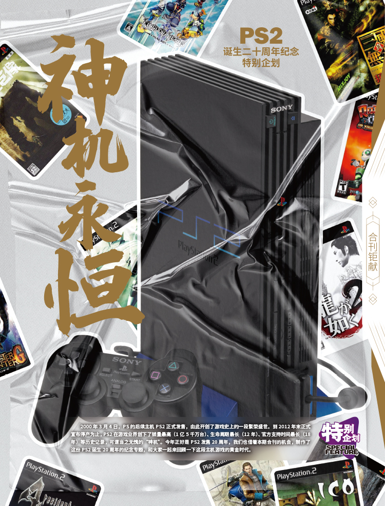 合刊主打内容为PS2诞生二十周年纪念特别企划,于2000年3月4日诞生的PS2是中国玩家心目中的一代神机。特别企划先以开篇特稿回顾PS2从诞生到停产的一生,另有大事记、游戏百强榜、七大创举、冷知识等精彩内容。同时会为大家盘点PS2上那些令中国玩家记忆犹新的原创作品、再续精品、璀璨群星,每个从PS2时代走来的玩家都不容错过。